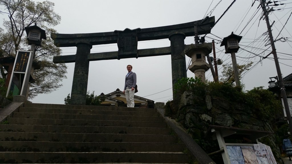 When we arrived, we took the cable car up the mountain and walked up the rest of the way. We had udon for lunch at a small local restaurant that had low tables on tatami mats and a spectacular view of the town and mountain. After a while, we arrived at the famous Kane-no-Torii, which is said to have been made from the same metal as the Big Buddha in Todaiji in Nara. It is one of the three most famous torii gates in Japan, along with the one at Itsukushima-jinja in Miyajiima, and the one at Tennoji in Osaka.