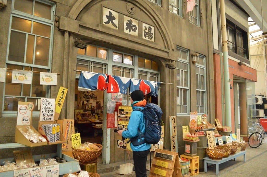 On the second day, I woke up early and continued my trip using the local train and headed down towards Tokushima prefecture. Upon reaching Ooboke Station, I took the local bus (me being the only passenger) up the mountains via slippery and snowy roads. I reached my destination of Kazurabashi about an hour later, and I was amazed by an old, but beautiful, vine bridge. Later on, I walked about a kilometer to my second goal: an outdoor hot spring with a spectacular view of the surrounding mountains. I rode a ropeway car up from the hotel to the onsen, and (once again) I was the only one there! I finished this nice day by going to Akaoni (the red ogre), a local izakaya, back in Sanuki Saita with my new friends, Toshiaki-san and Zushi-san.