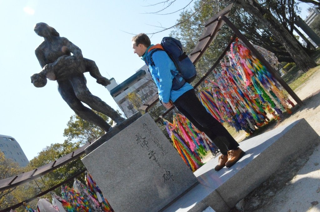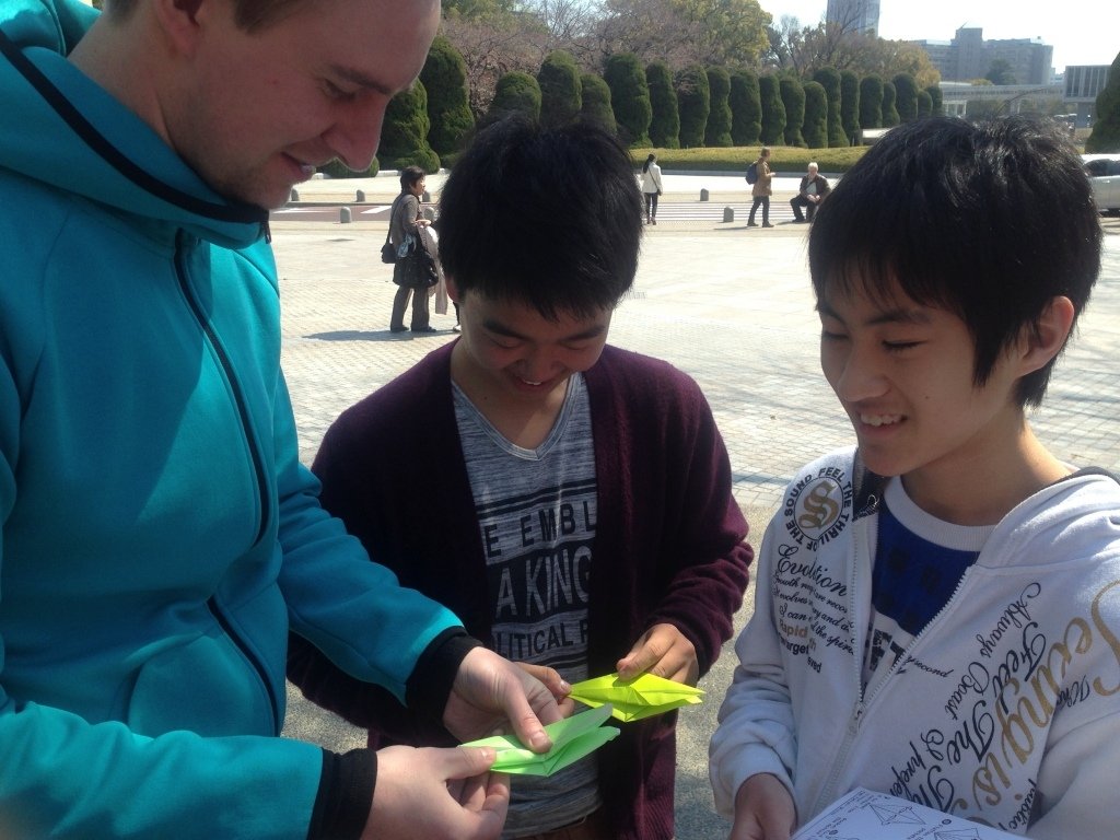 広島平和記念公園では、高校生たちの学校のプロジェクトの一貫として平和のシンボルである折り鶴を一緒に折るように声を掛けられました。平和記念公園にいる間たくさん高校生に出会ったので、その都度一緒に鶴を折りました。原爆資料館で被爆した方々の影響や原爆の恐ろしさを見たあとは一日中もの悲しい気持ちでした。資料館をあとにして、陽が沈む前に縮景園に行って盆栽の木や池にいた亀や鯉の姿を見て楽しみました。だんだん辺りが暗くなってきたときに、日本のピザ(お好み焼き)のお店が集まる村、”お好み村” へ、足を延ばしました。そこで麺とたくさんの野菜で作られた広島風のお好み焼きを食べました。