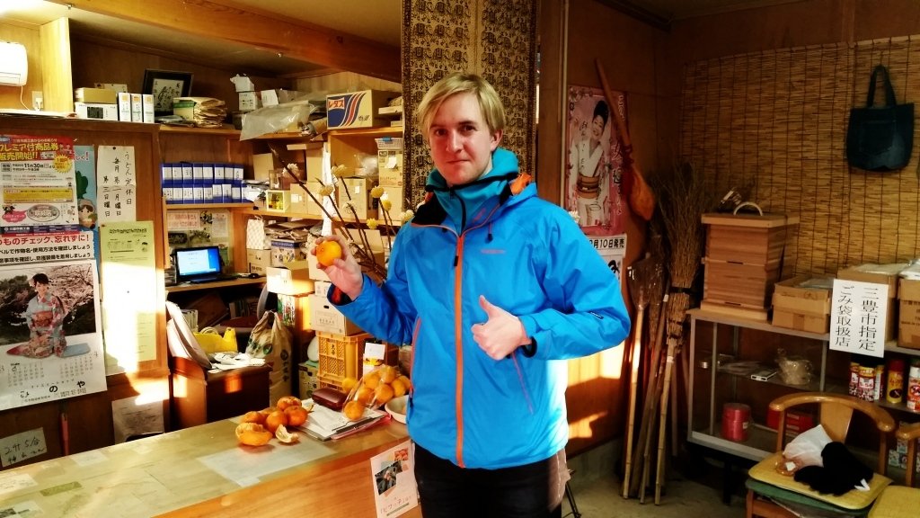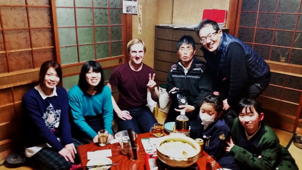 次に高松の繁華街を探索した後、JRに乗って最終的に讃岐財田に着きました。四国の真ん中にある小さい村です。私の友達の友達であるとしあきさんと会いました。彼はゲストハウスのオーナーです。彼と彼の友達は小さな鍋パーティーで私を歓迎してくれました!